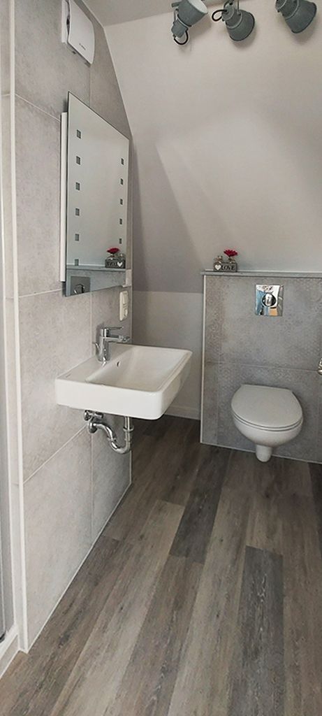 Der Wohnungseingang beginnt mit einem offenen Wohn-/Essbereich und einer großen Couch. Von dort aus sind die einzelnen Zimmer begehbar. Das moderne Badezimmer mit Tageslicht verfügt über eine Dusche und ein WC.